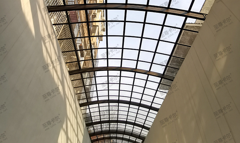 頂部用的是2.0mm聚碳酸酯板材,透光性能好(透光率88%)在陽光下曝曬不會產生黃變、霉化、透光不佳。表面有防紫外線的共擠層(uv涂成),可防止太陽紫外線引起的樹脂疲勞變黃。表面共擠層具有化學吸收紫外線并轉化為可見光。對植物光合作用有良好的穩定效果,極適合保護汽車使其免受紫外線破壞。