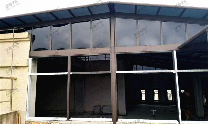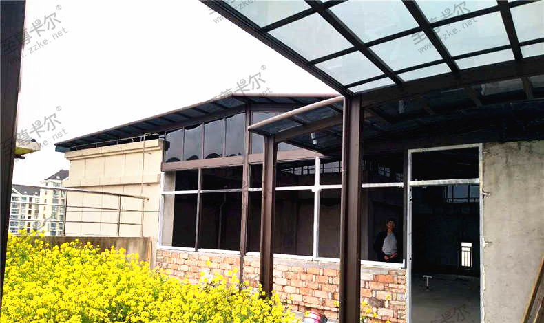 中鑫建設集團的戶外遮陽雨棚連側面也都封上了我們防紫外線的聚碳酸酯板,就確保了雨水不僅滲透進來。整個材料用的是我們簡約之星咖啡色鋁合金骨架,淺灰色聚碳酸酯板。